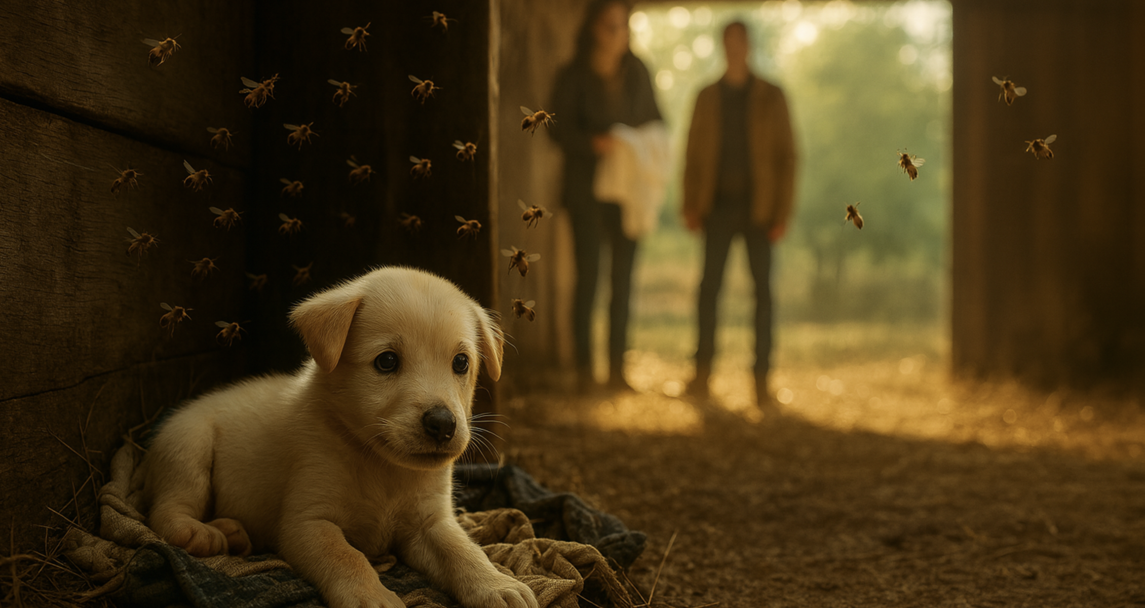 レオが震える小さな体をタオルに包むと、ハチたちは穏やかに羽音を響かせ、まるで守るようにその周りを飛びました。そこにいたのは、生まれたばかりの子犬。白い足は泥で汚れ、体には小さな傷。そして片方の耳には、ほんのりとハチミツがついていました。