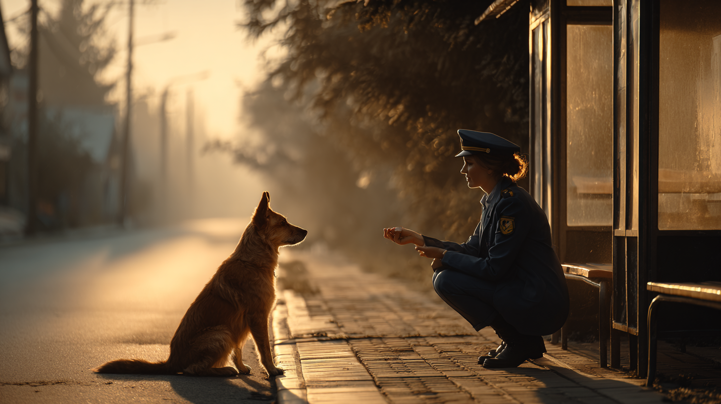 ローラは少し離れたところに餌と水を置き、道端に腰を下ろした。「大丈夫よ、怖くないから」マックスは匂いを嗅ぎながらも、すぐには近づかない。数日間、ローラは毎日通った。穏やかに声をかけ、バスの出来事や乗客の話をした。少しずつ、マックスは距離を縮めていった。ある日、ついにマックスが彼女の膝にそっと頭をのせた。ローラは息をのんだまま、微笑んだ。「そう、いい子ね。もうひとりじゃないよ」