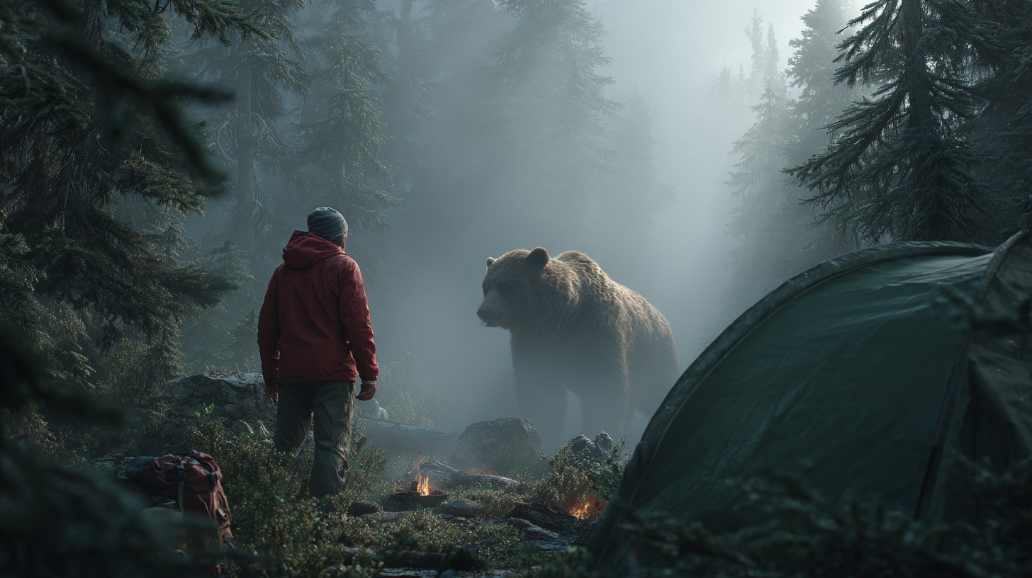 ライアンは体を固めたまま動きませんでした。逃げるのは危険だと分かっていたからです。熊の瞳は深く、どこか知性を感じさせます。「おい…大丈夫だぞ…」と小さく声をかけながら、バックパックの中の熊よけスプレーに手を伸ばそうとしました。しかし、少しでも動けば刺激してしまう。熊は静かに一歩、また一歩と近づいてきます。土がわずかに沈むたび、ライアンの全身が強張りました。熊は首をかしげ、まるで何かを観察するようにじっと彼を見ています。