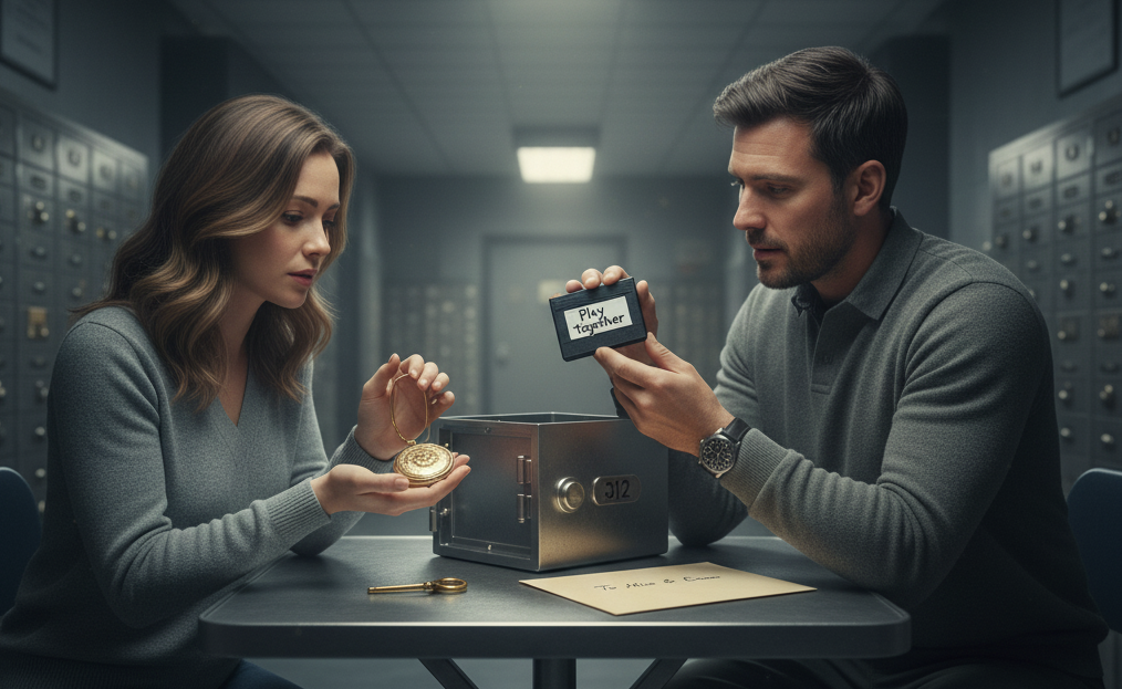 翌朝、二人は静かな金庫室で貸金庫312を開けました。中には「一緒に再生して」と書かれたテープと、二人の名前が書かれた封筒、そして小さなロケットペンダント。
